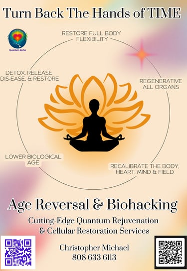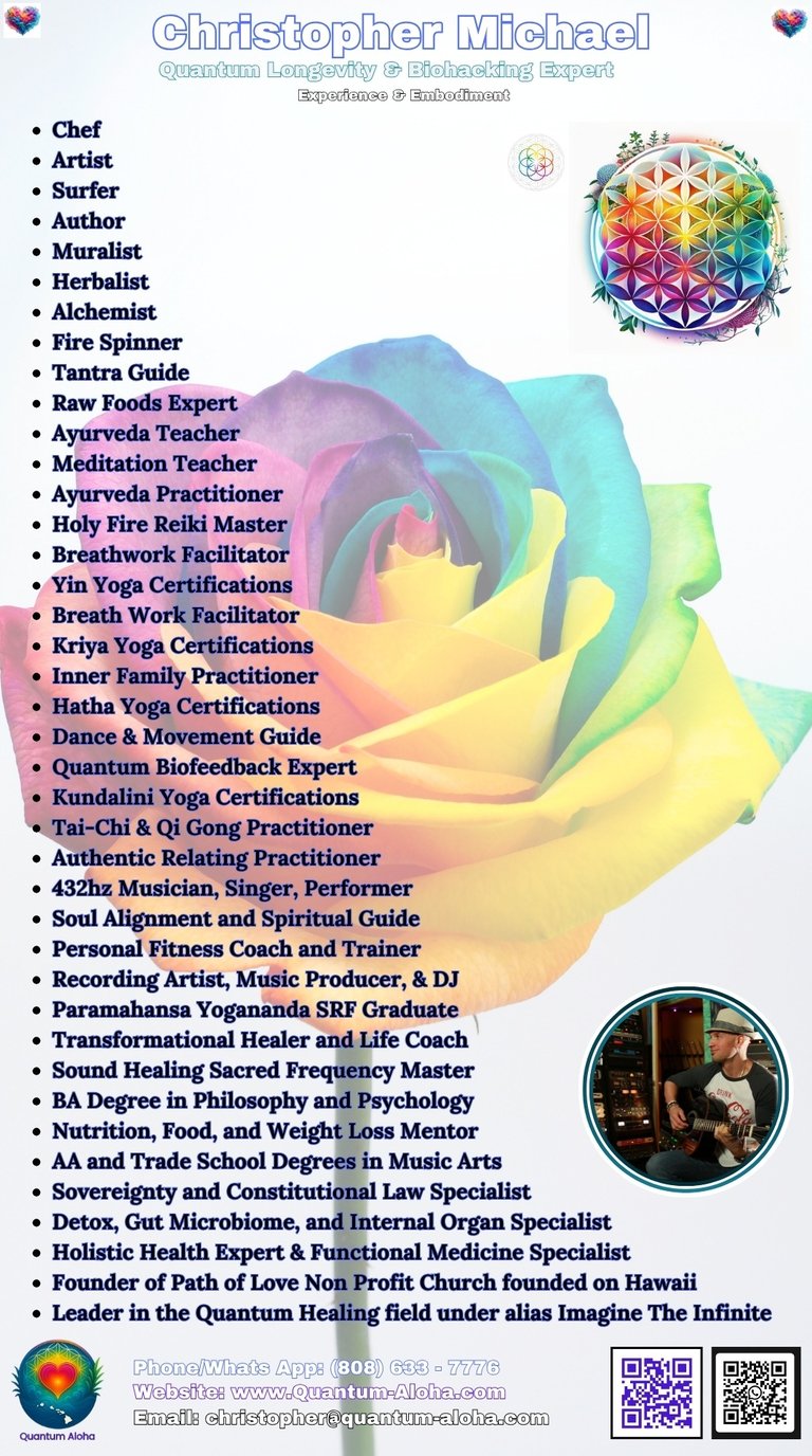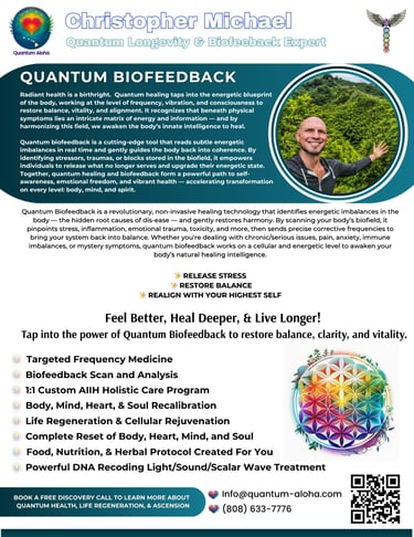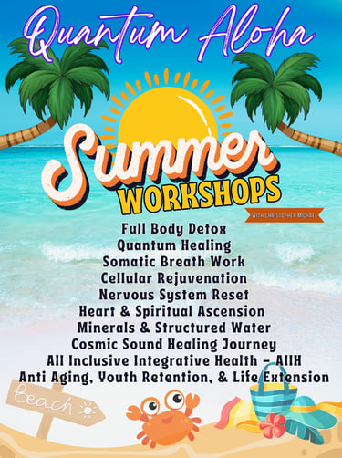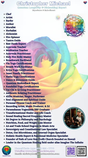 Whether you're seeking physical rejuvenation, emotional clarity, energetic balance, organ regeneration, life extension, heavy metal detox, chronic dis-ease remedy, quality of life increase, body maintenance, autoimmune reversal, or spiritual awakening—your presence on this website today is no accident. You are ready to rise. Please allow Christopher Michael, your Quantum Aloha guide, to serve you.