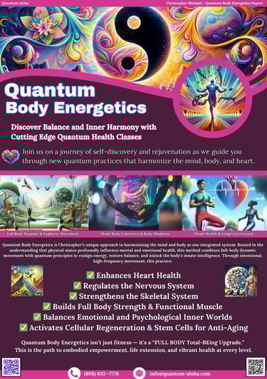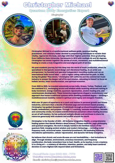 Christopher Michael is a pioneering voice in the global healing renaissance—and the guiding force behind Quantum Aloha™ , a next-generation wellness movement uniting quantum science, vibrational medicine, and the sacred wisdom of Aloha.
