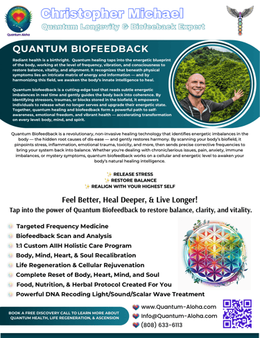 Whether you're seeking physical rejuvenation, emotional clarity, energetic balance, organ regeneration, life extension, heavy metal detox, chronic dis-ease remedy, quality of life increase, body maintenance, autoimmune reversal, or spiritual awakening—your presence on this website today is no accident. You are ready to rise. Please allow Christopher Michael, your Quantum Aloha guide, to serve you.